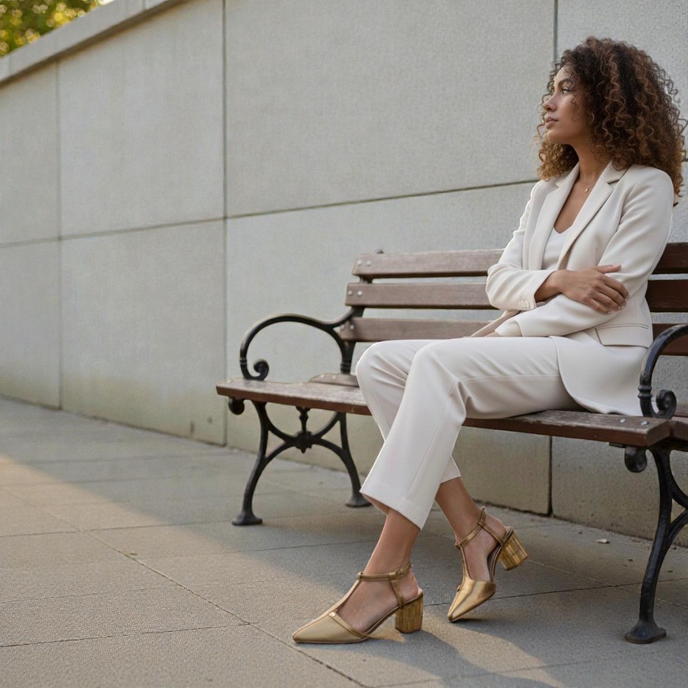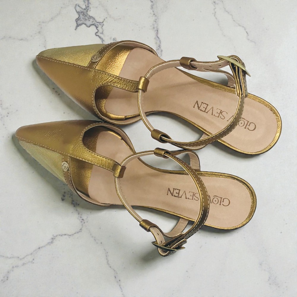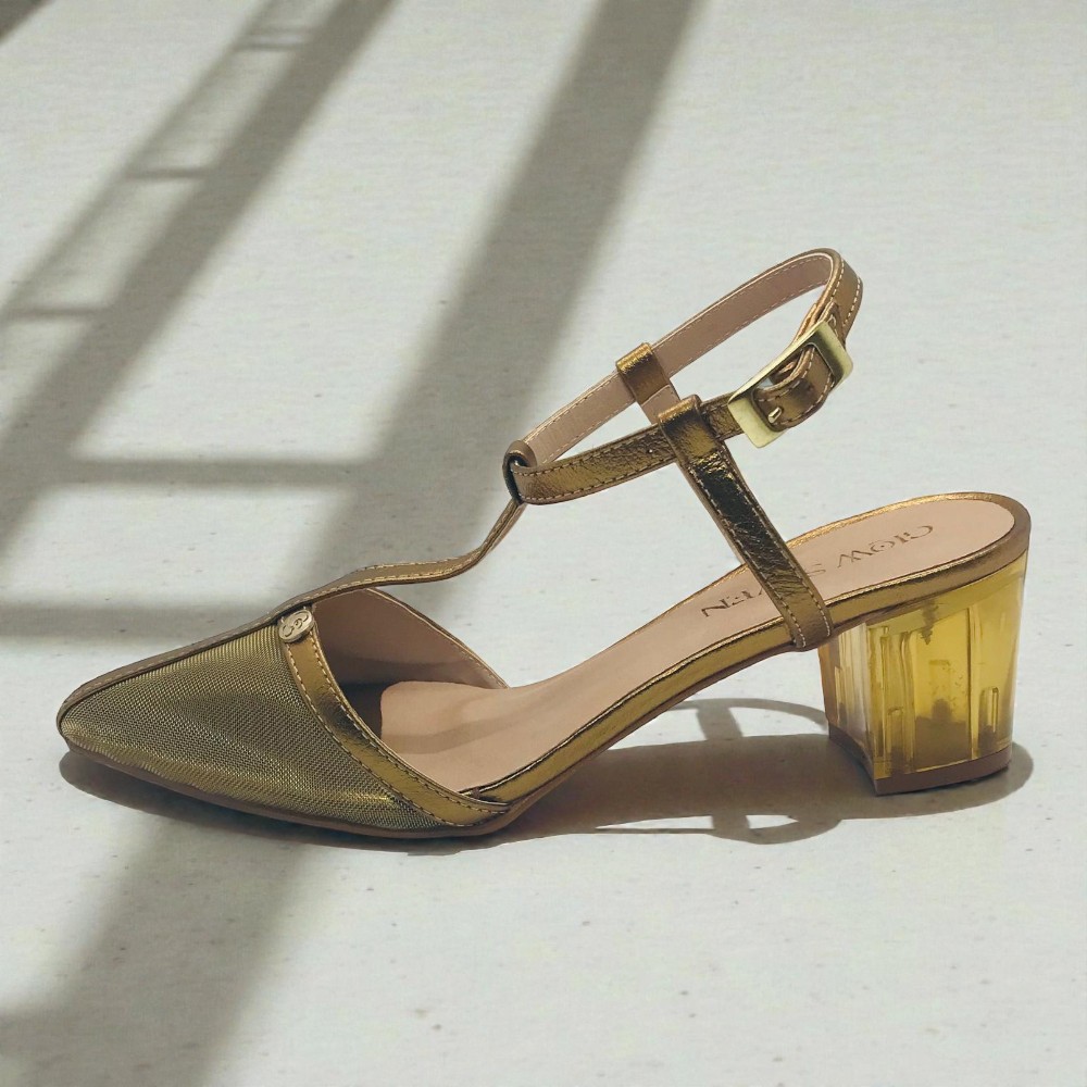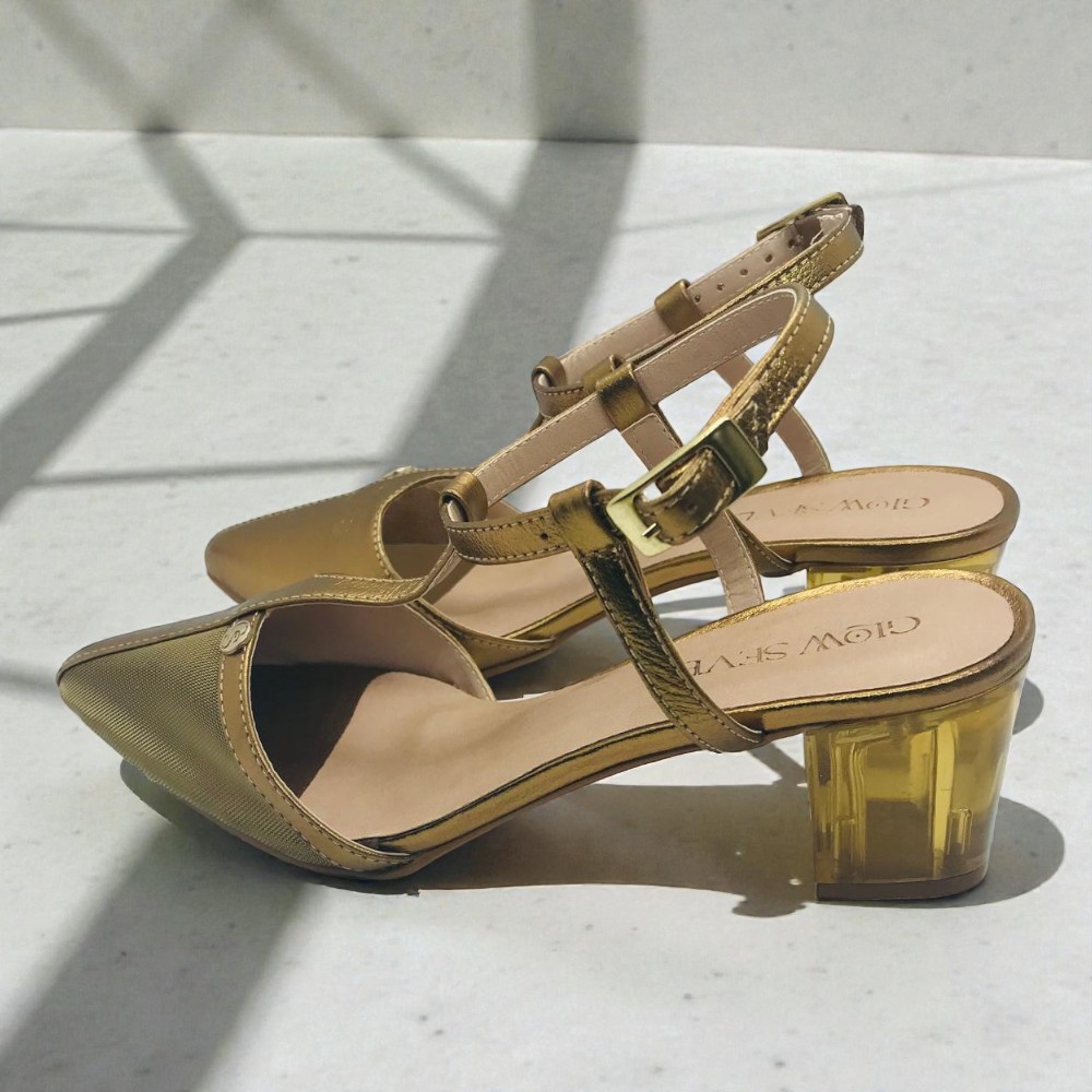 O Scarpin Lia traduz a essência luminosa da coleção Lumière. Confeccionado em couro e tela, apresenta um tom bronze sofisticado que, conforme a incidência da luz, revela nuances douradas, criando um efeito elegante e envolvente. O salto de 6 cm em acrílico, material utilizado também nas janelas de aeronaves, confere leveza visual, resistência e um toque contemporâneo ao design. A palmilha comfort garante bem-estar ao longo do dia, enquanto o rebite com a sigla GS surge como detalhe discreto, assinatura Glowseven. Lia é pensado para mulheres que apreciam a luz nos detalhes e a elegância que se revela com naturalidade.